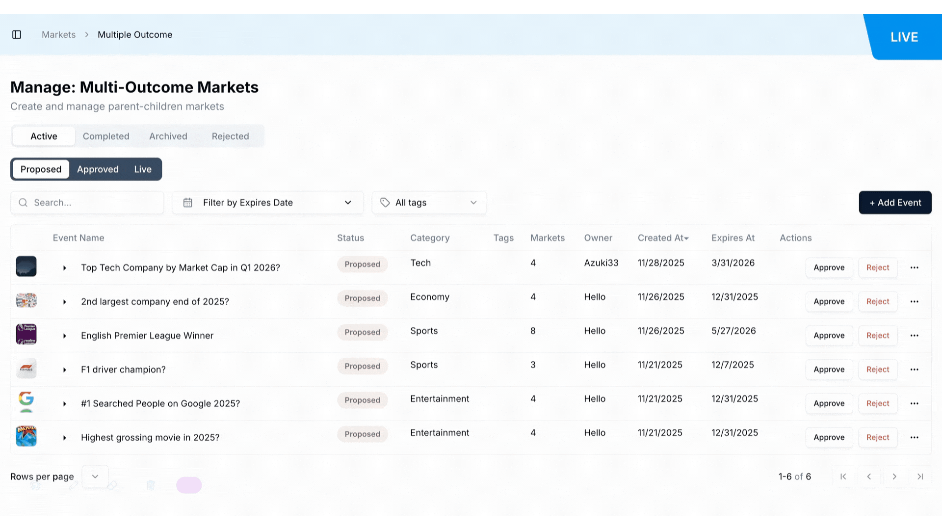 | Live | Active > Live | Published and actively trading on the platform | Propose Resolution, Edit item |