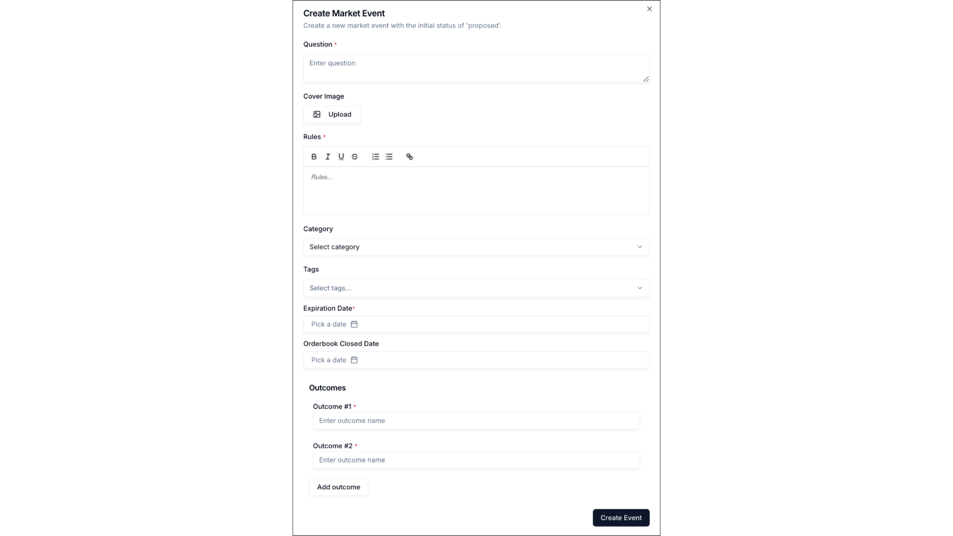 | Rules | Resolution rules defining how and when the event will be resolved (supports rich text formatting: bold, italic, underline, strikethrough, ordered lists, bullet lists, links) | Yes | Creation form, detail page |