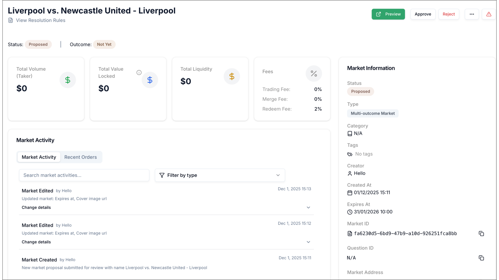 Q: What happens if I reject a parent event? A: Rejecting a parent event automatically rejects all child markets. They move to the Rejected tab and are no longer active. Verify by checking the Rejected tab and expanding to see all rejected children.