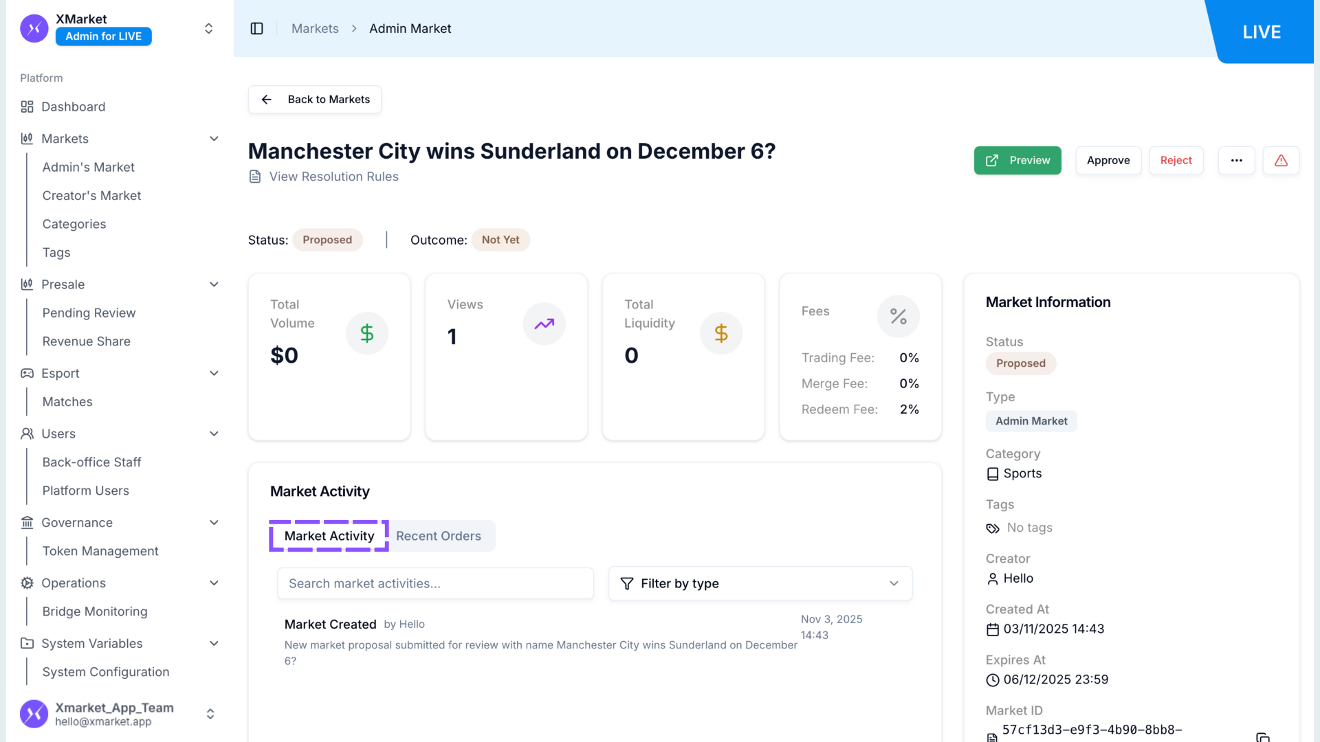 OverviewCentral hub for reviewing, approving, publishing, and managing creator submitted prediction markets.