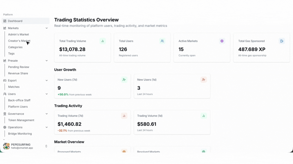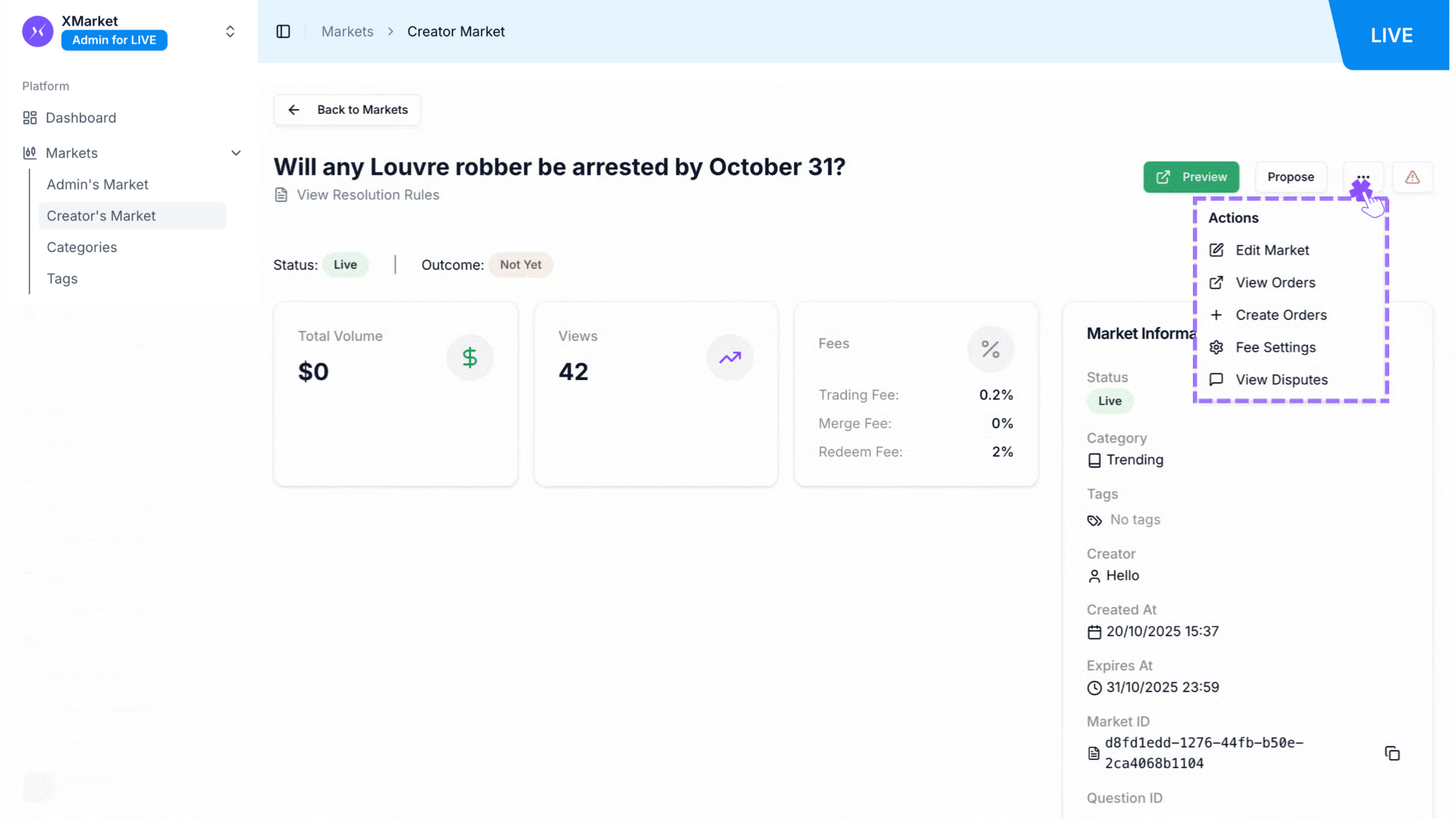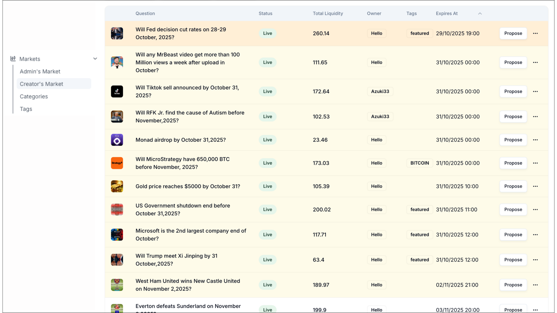 OverviewCentral hub for reviewing, approving, publishing, and managing creator submitted prediction markets.