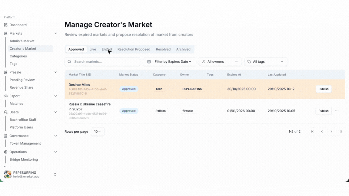 1Navigate to Approved TabClick the Approved tab to view all creator approved markets awaiting publication.