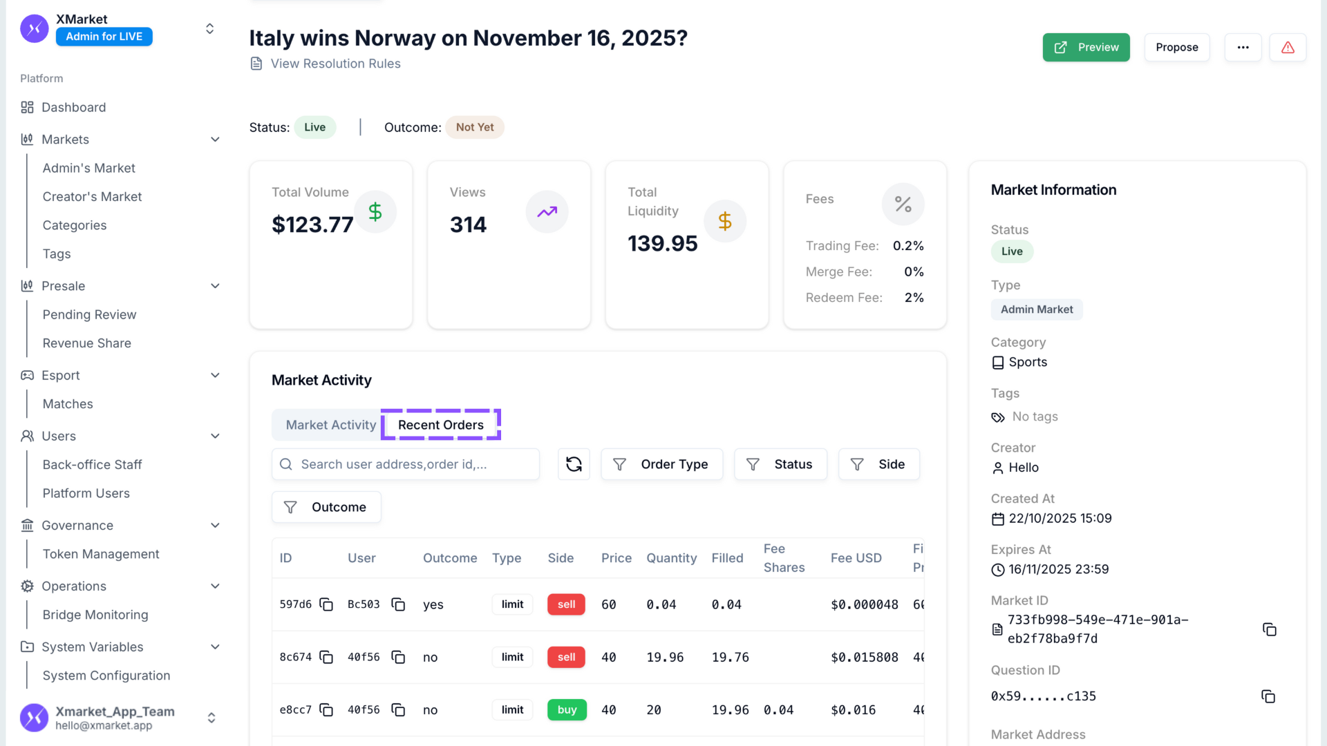 The market becomes visible to all platform users and trading begins immediately. Traders can place orders and the market appears in the main markets list.
