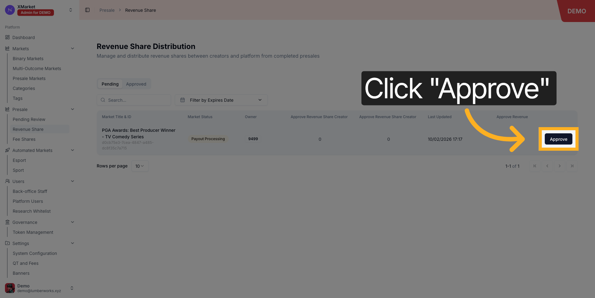 Approve the revenue-share distribution for one market so that the row moves from Pending to Approved and a transaction hash is available.